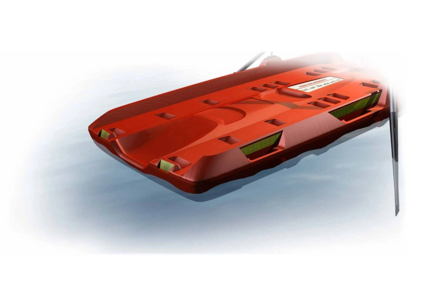 With a buoyancy capacity exceeding 300 kg, the raft provides a stable surface for multiple rescuers. The reflective markings on the deck, handles, and sign help indicate safe entry and exit points from the water, improving both orientation and safety during rescue operations.